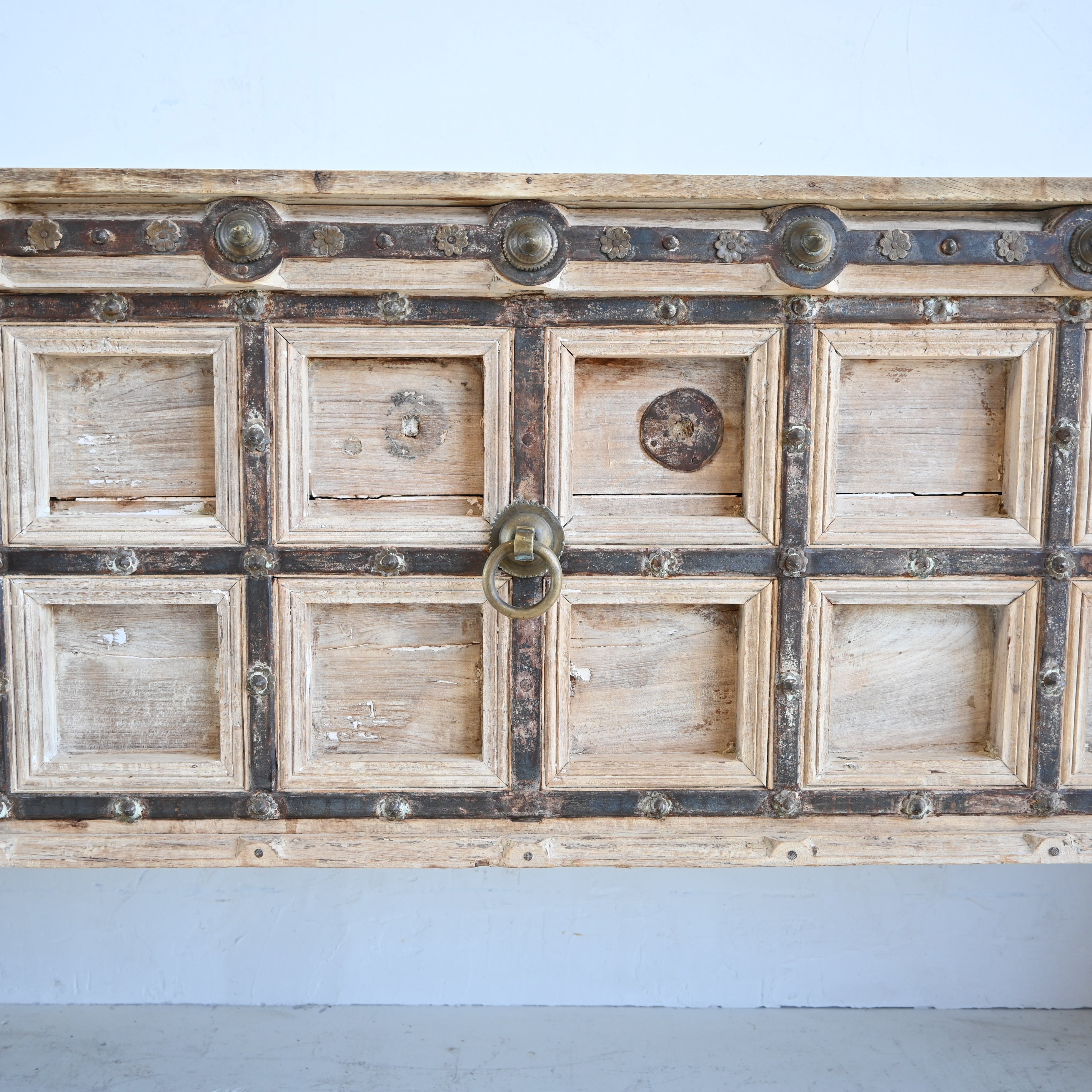 This original console has been handmade, combining a vintage Indian door panel finished with iron strapping and tiny flower studs with intricately carved pillars for the legs. It has been stripped of all colour and lightened, to obtain the soft weathered patina that we specialise in. This console would make a stunning entrance or living room statement, or even as a unique vanity in a bathroom.