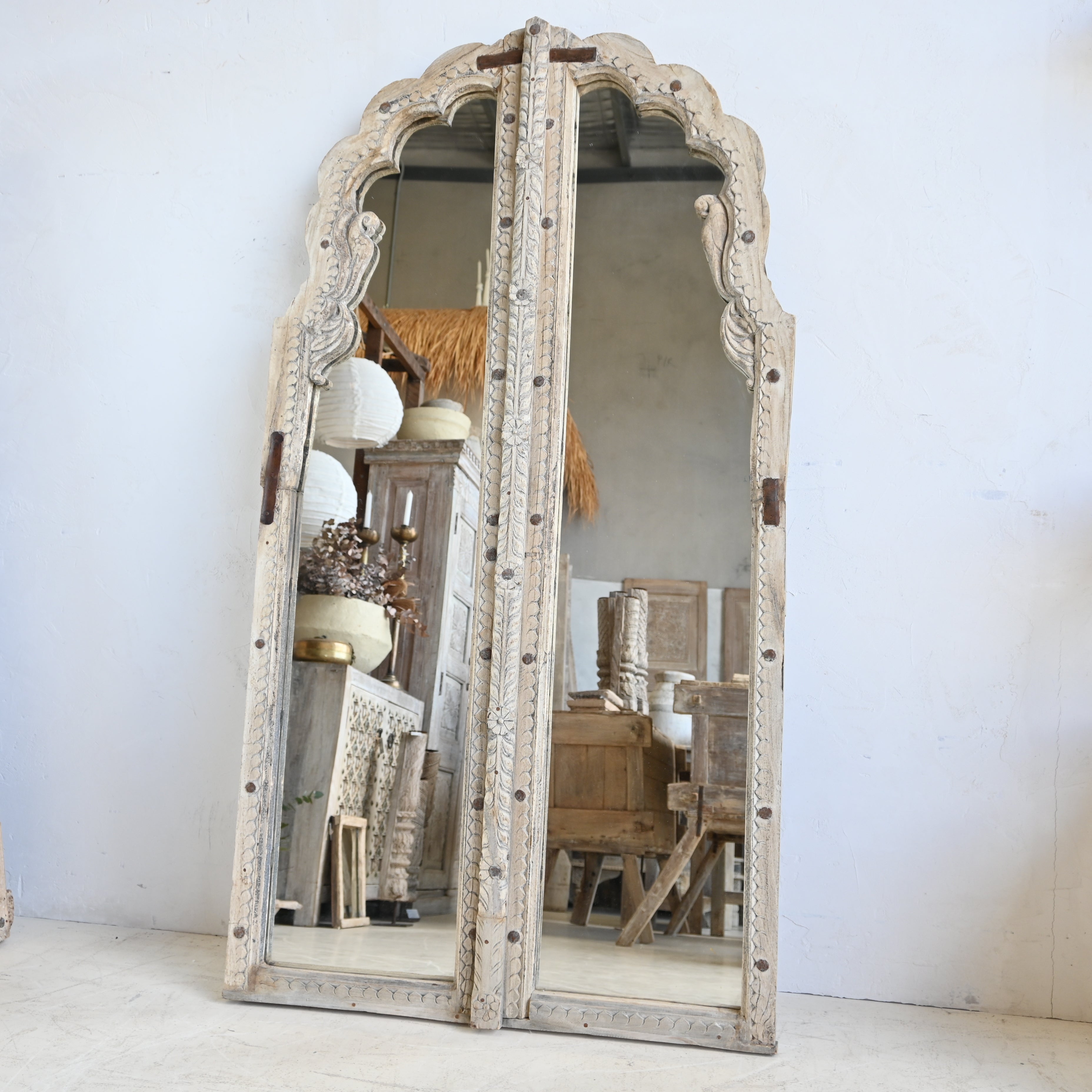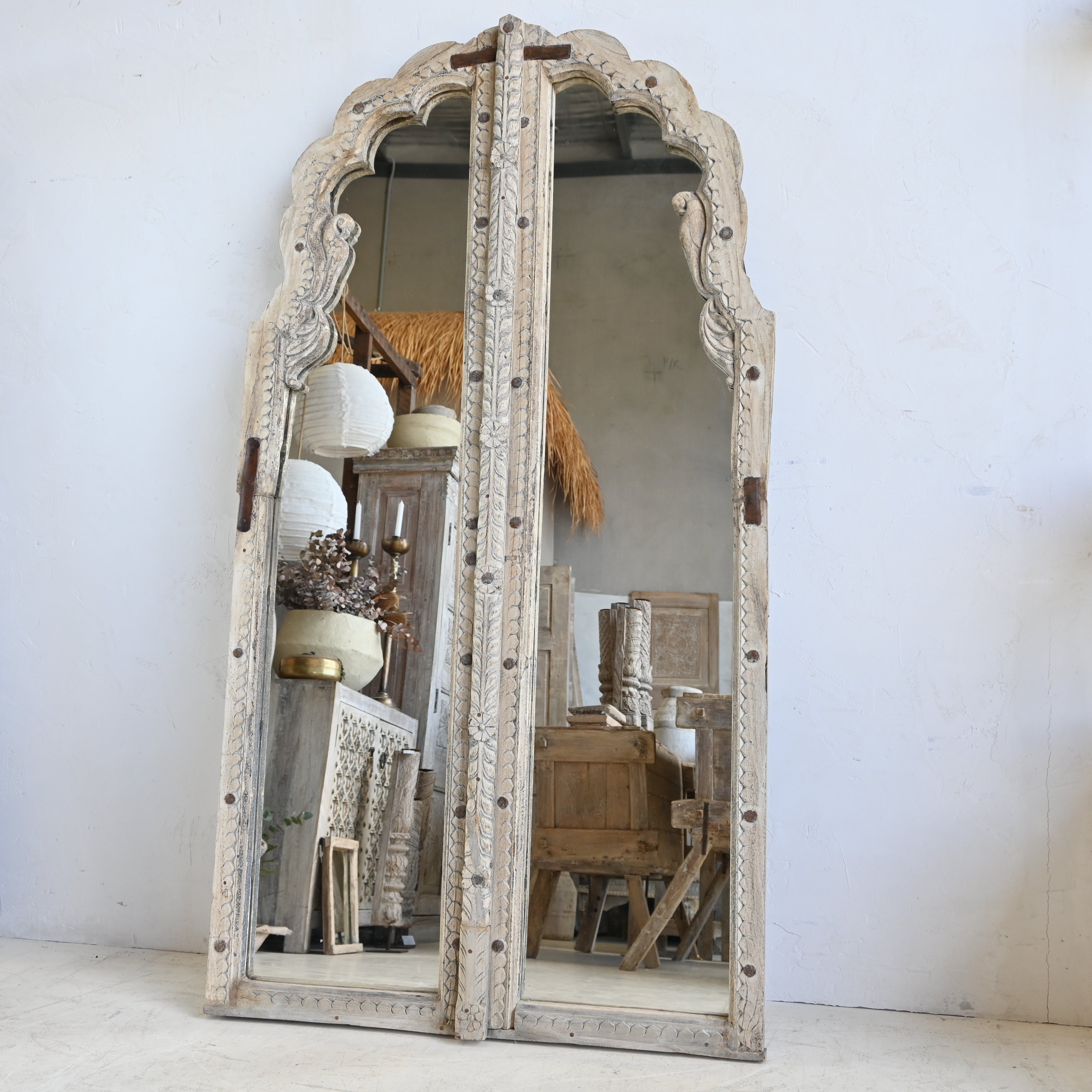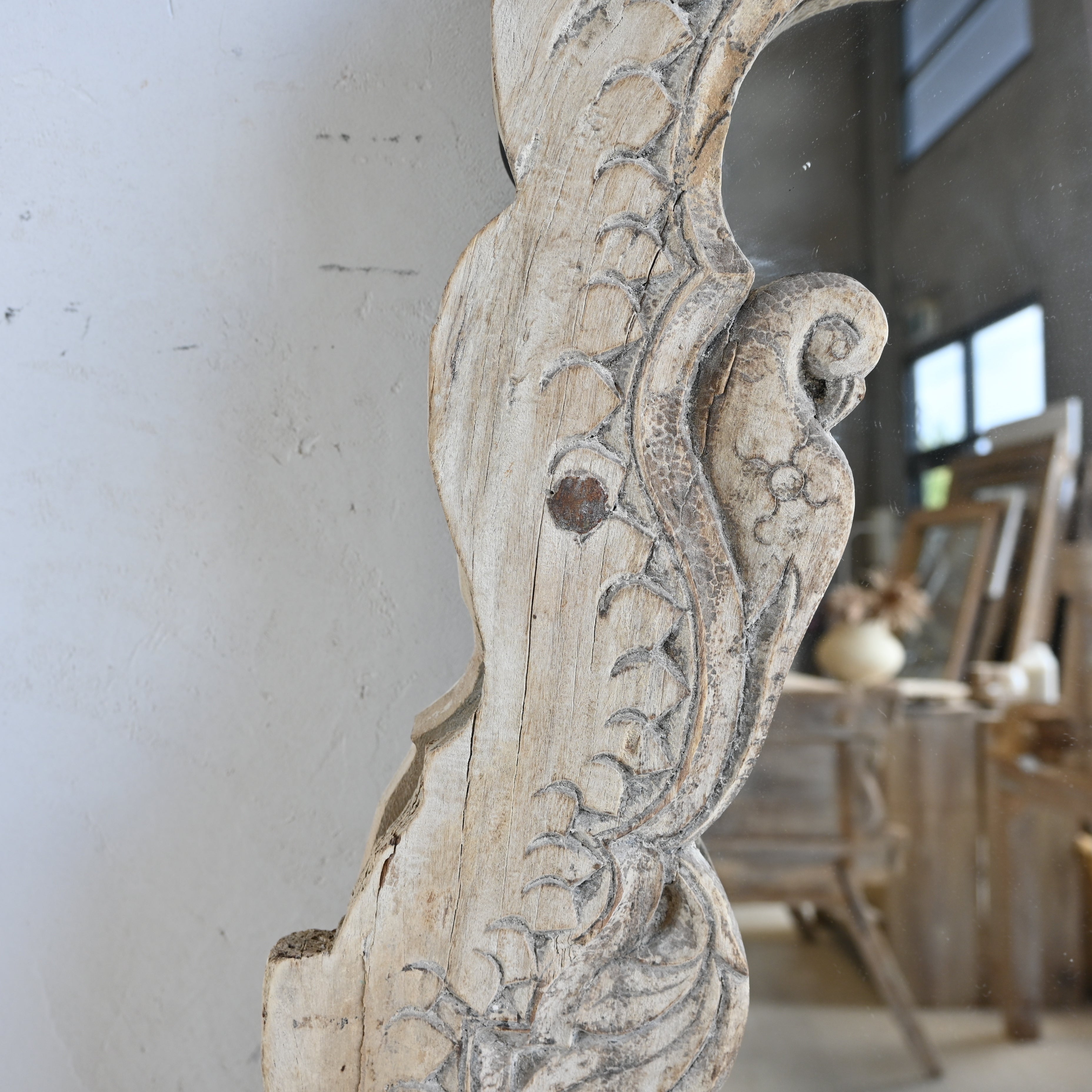 This Vintage one of a kind mirror, sourced in North West India, is made using an old teak window frame, carved in intricate detail. It has been lightened to create a soft light creamy, beige colour highlighting it's beautiful aged patina. This stunning piece will create impact in any area of your home, not only will it be a talking piece, Mirrors bounce light around and create the illusion of a larger, brighter space.