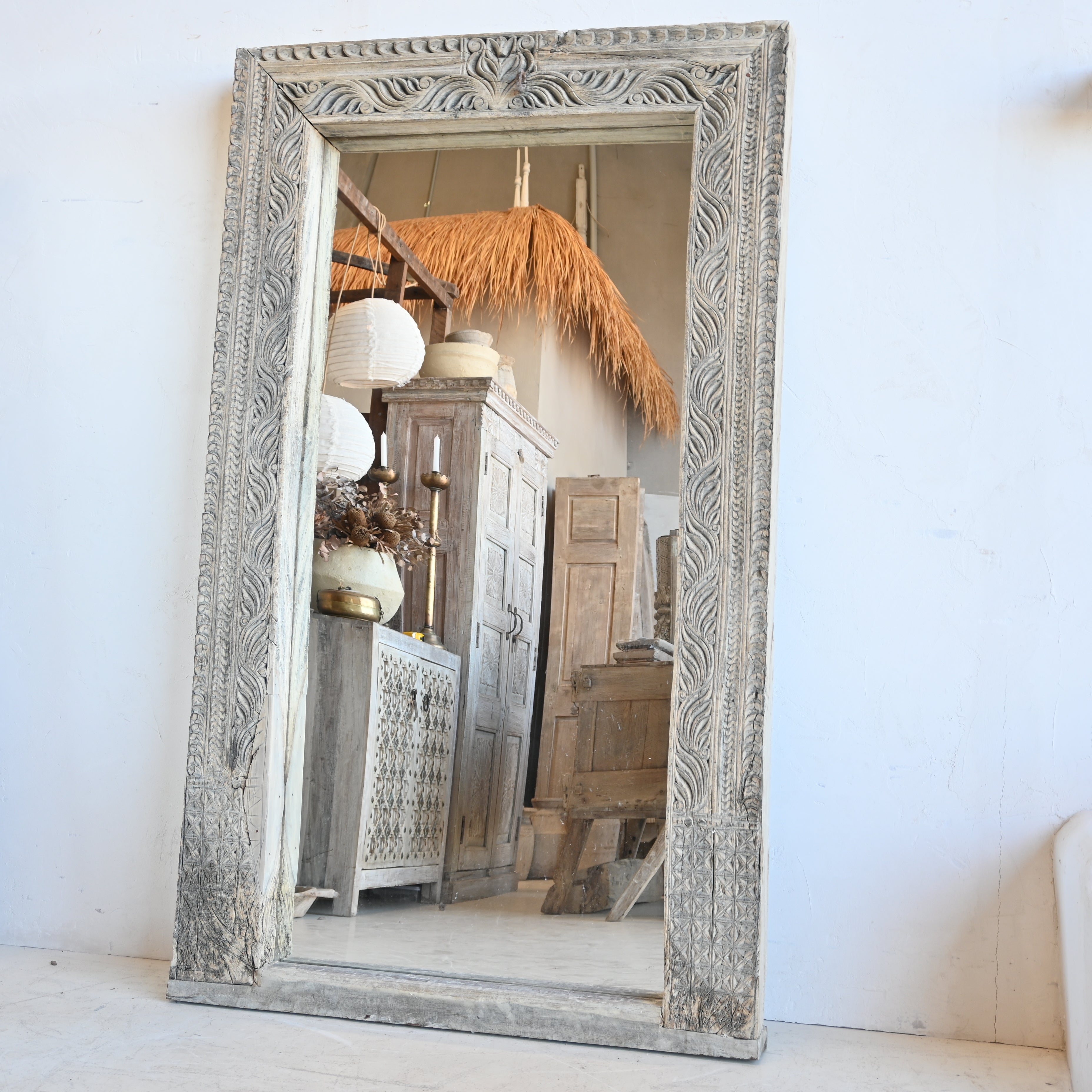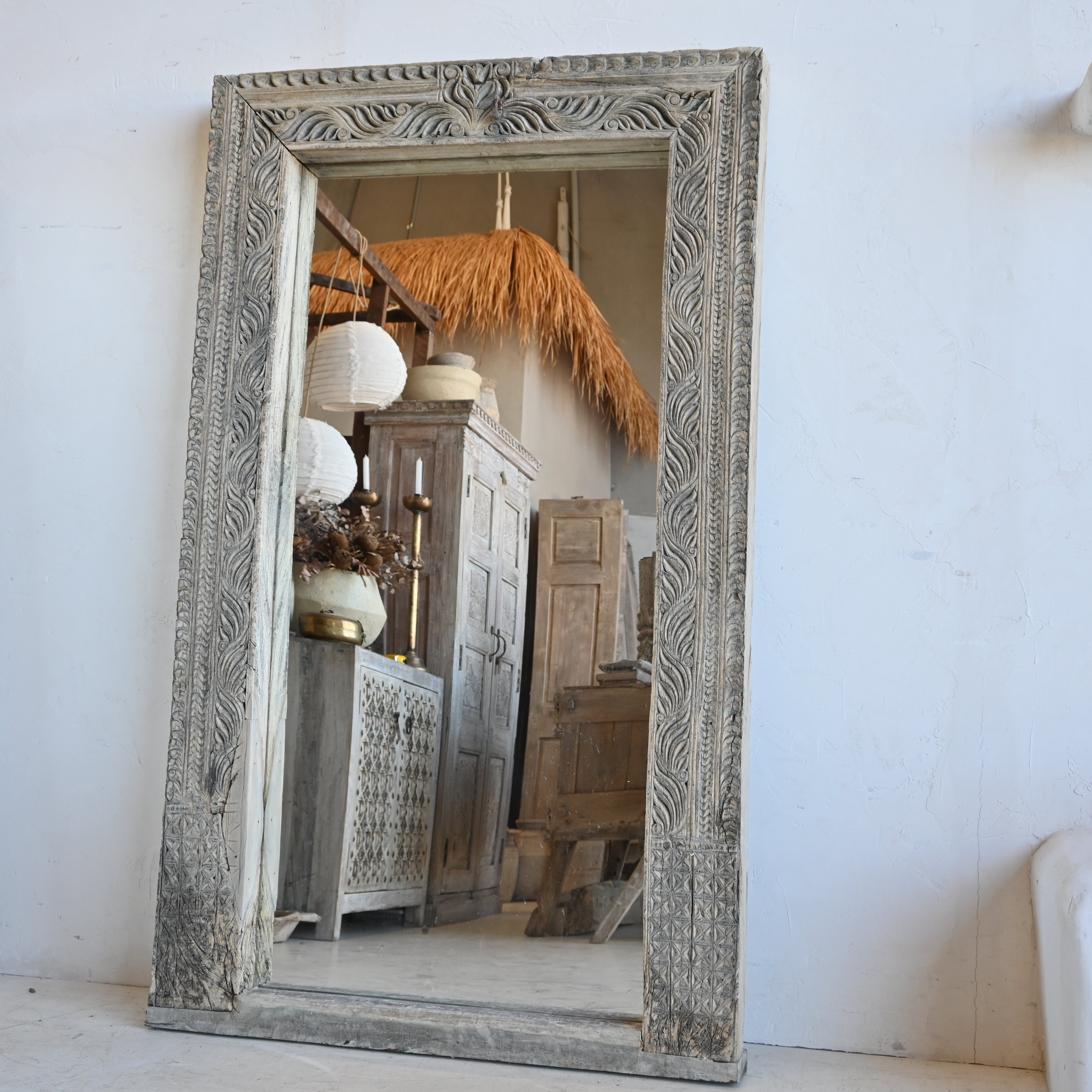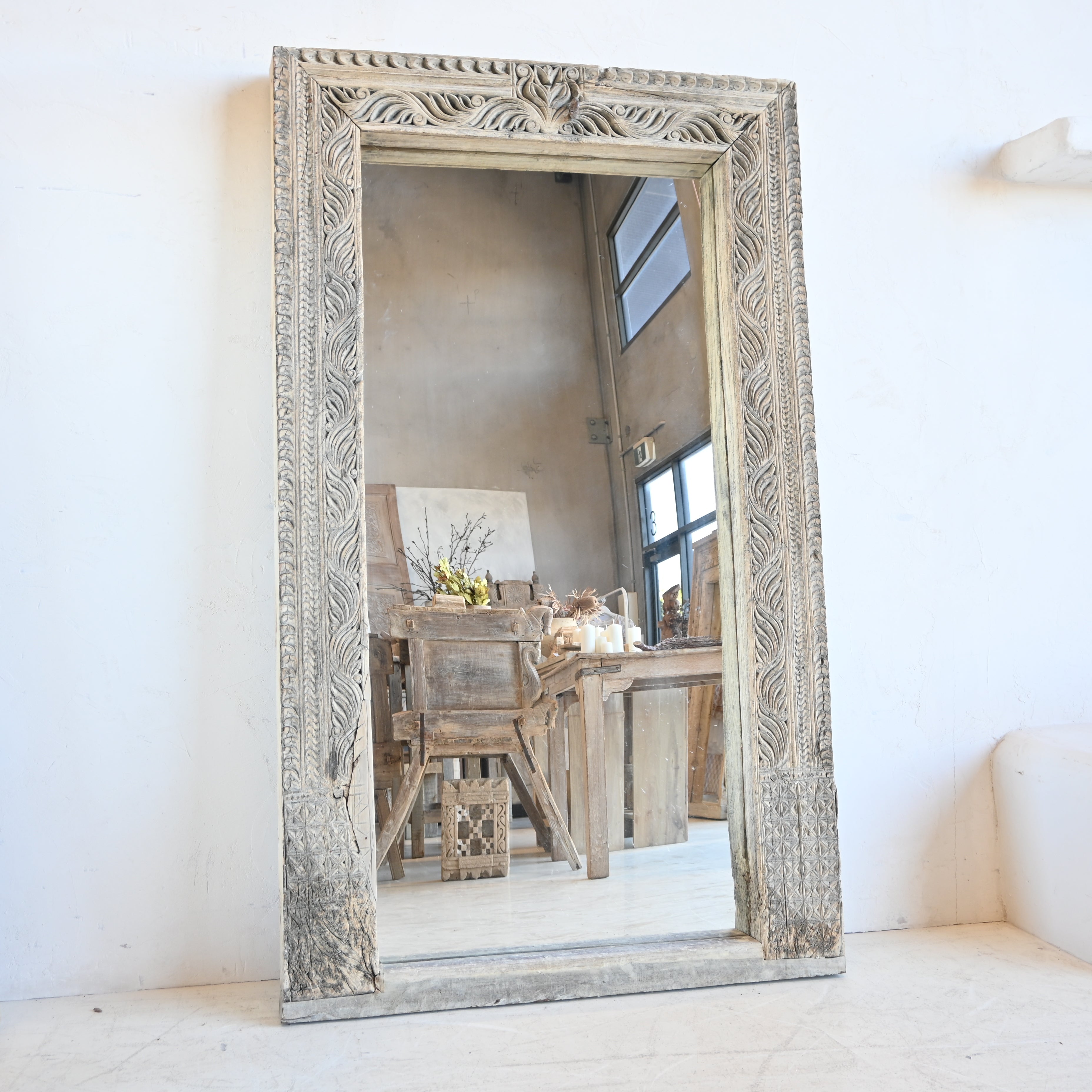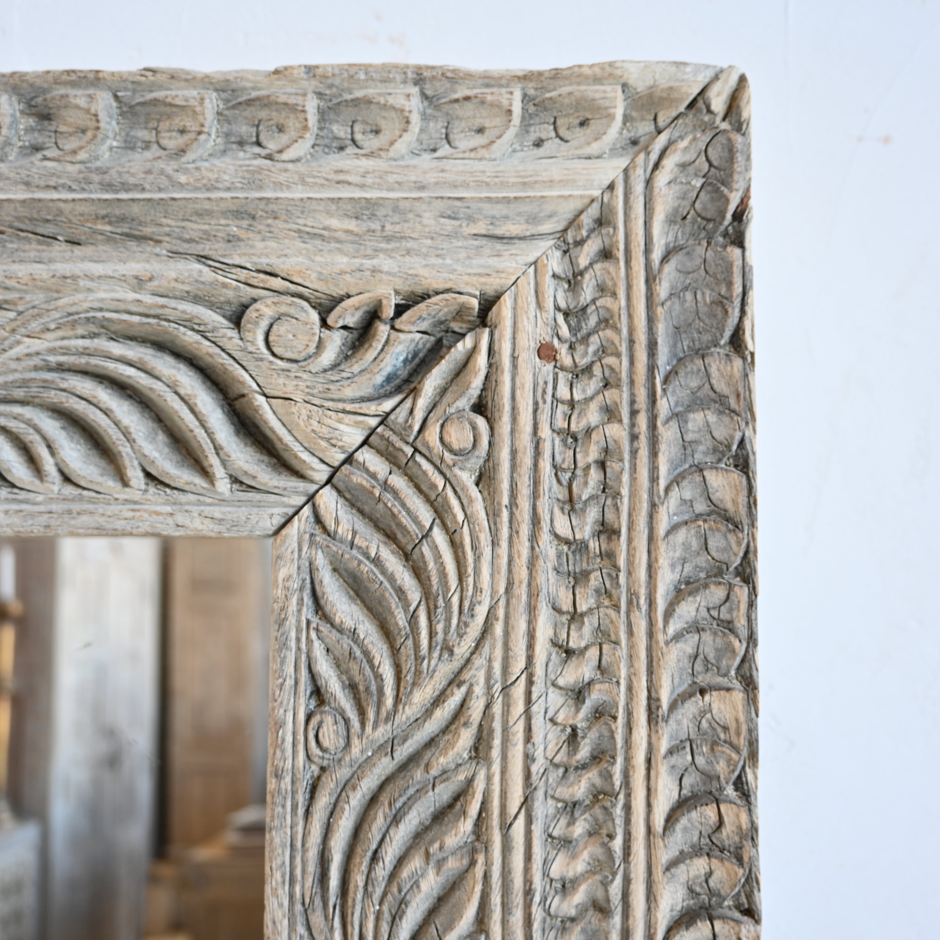 This Vintage one of a kind mirror, sourced in North West India, is made using an old teak Door frame, carved in intricate detail. It has been lightened to create a soft light creamy, beige colour highlighting it's beautiful aged patina. This stunning piece will create impact in any area of your home, not only will it be a talking piece, Mirrors bounce light around and create the illusion of a larger, brighter space.