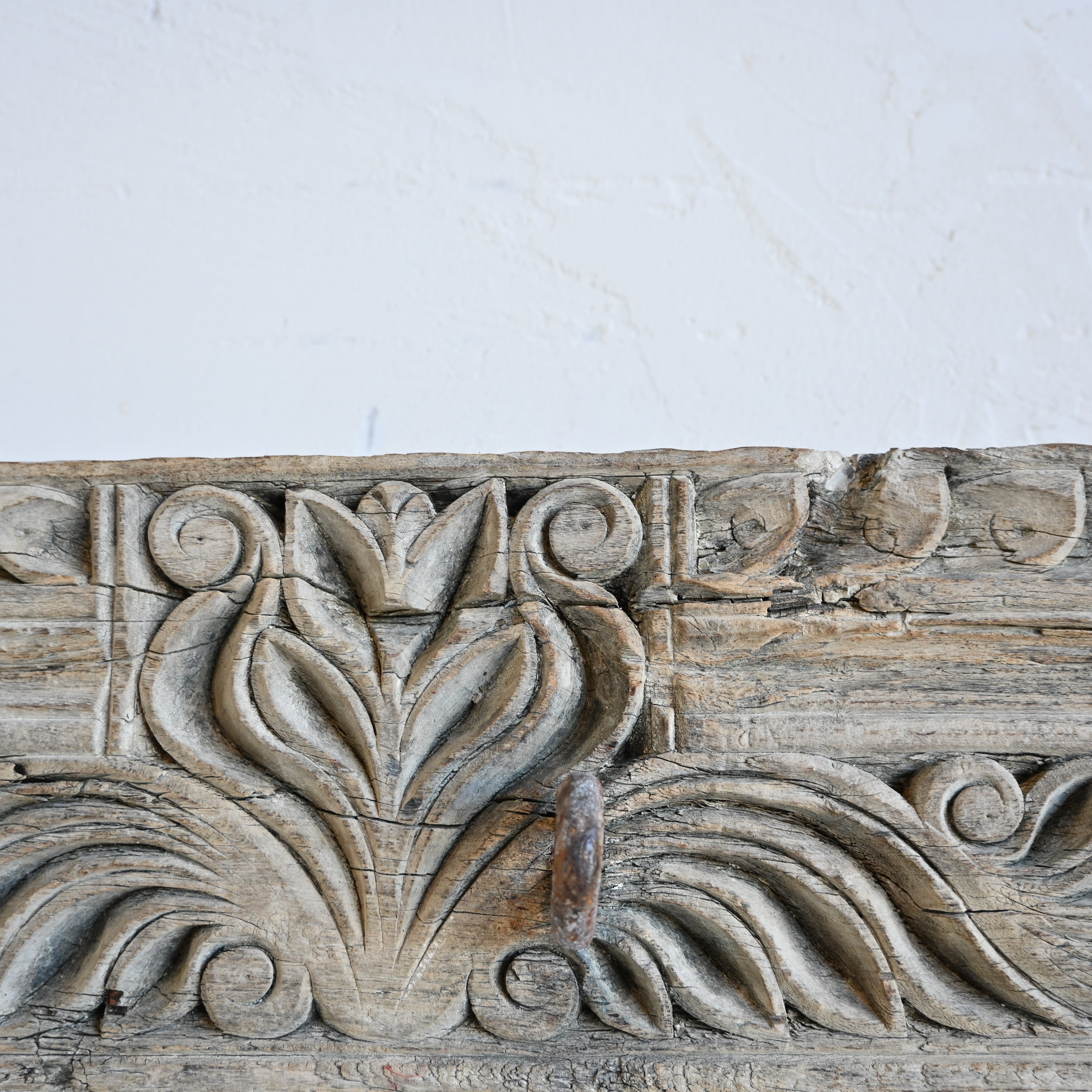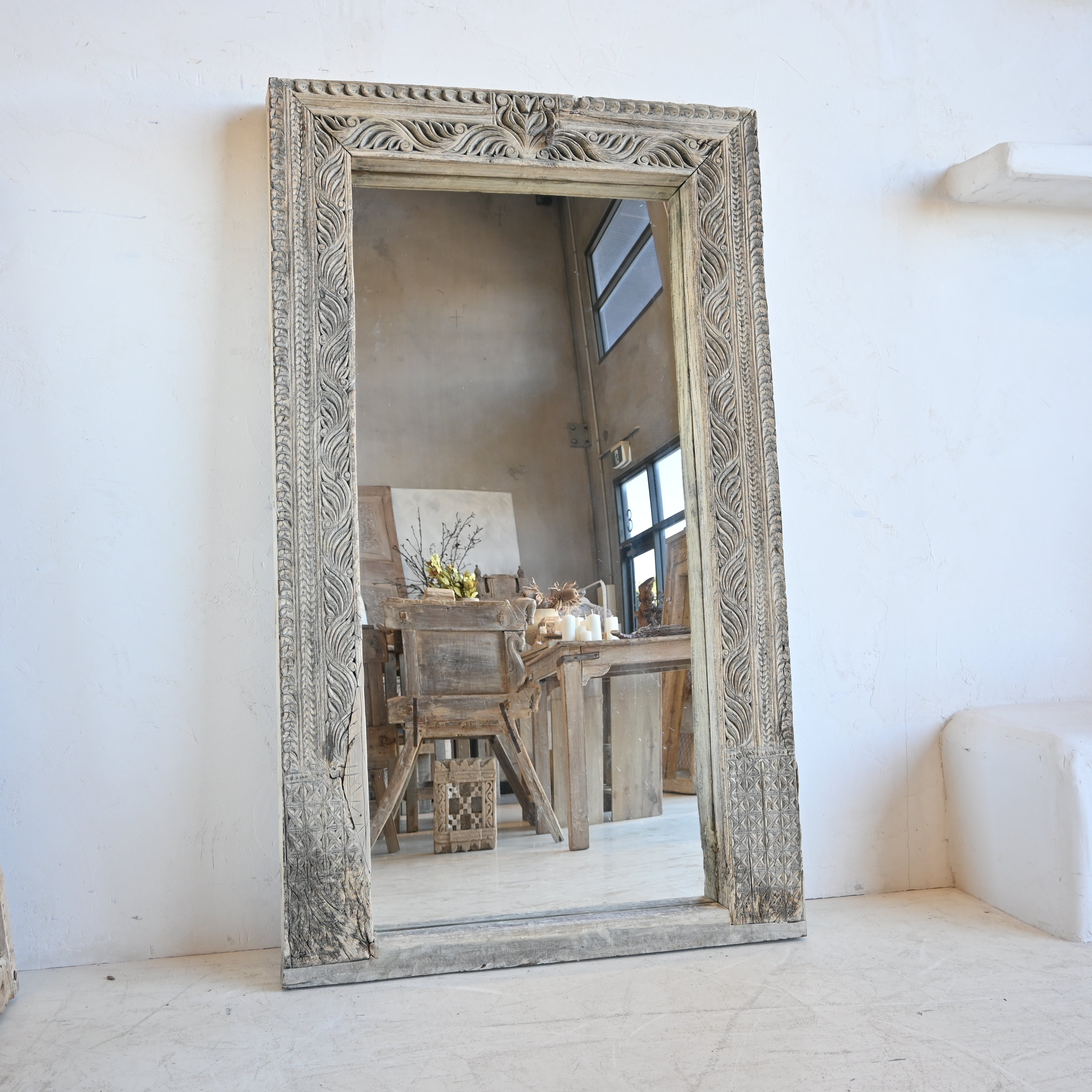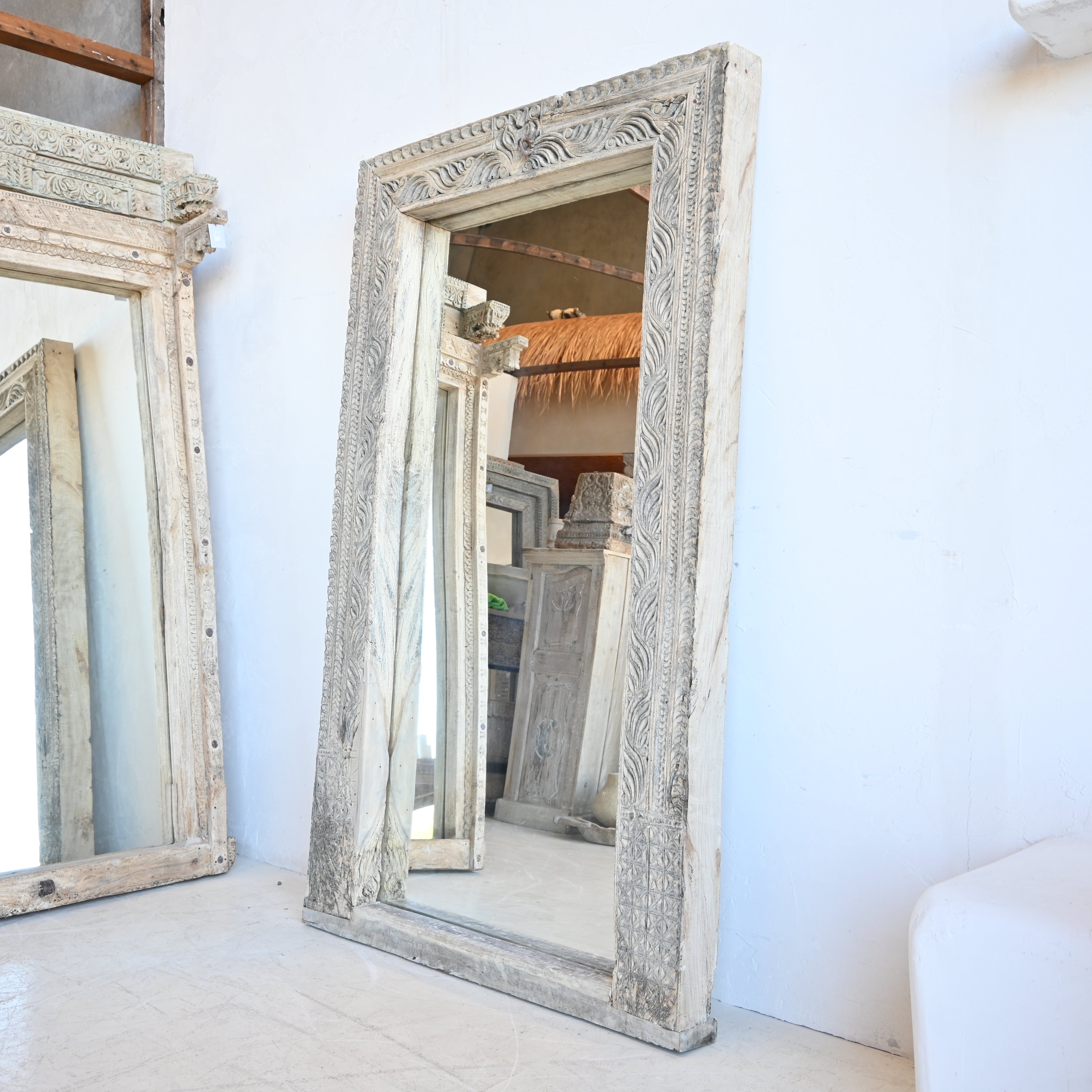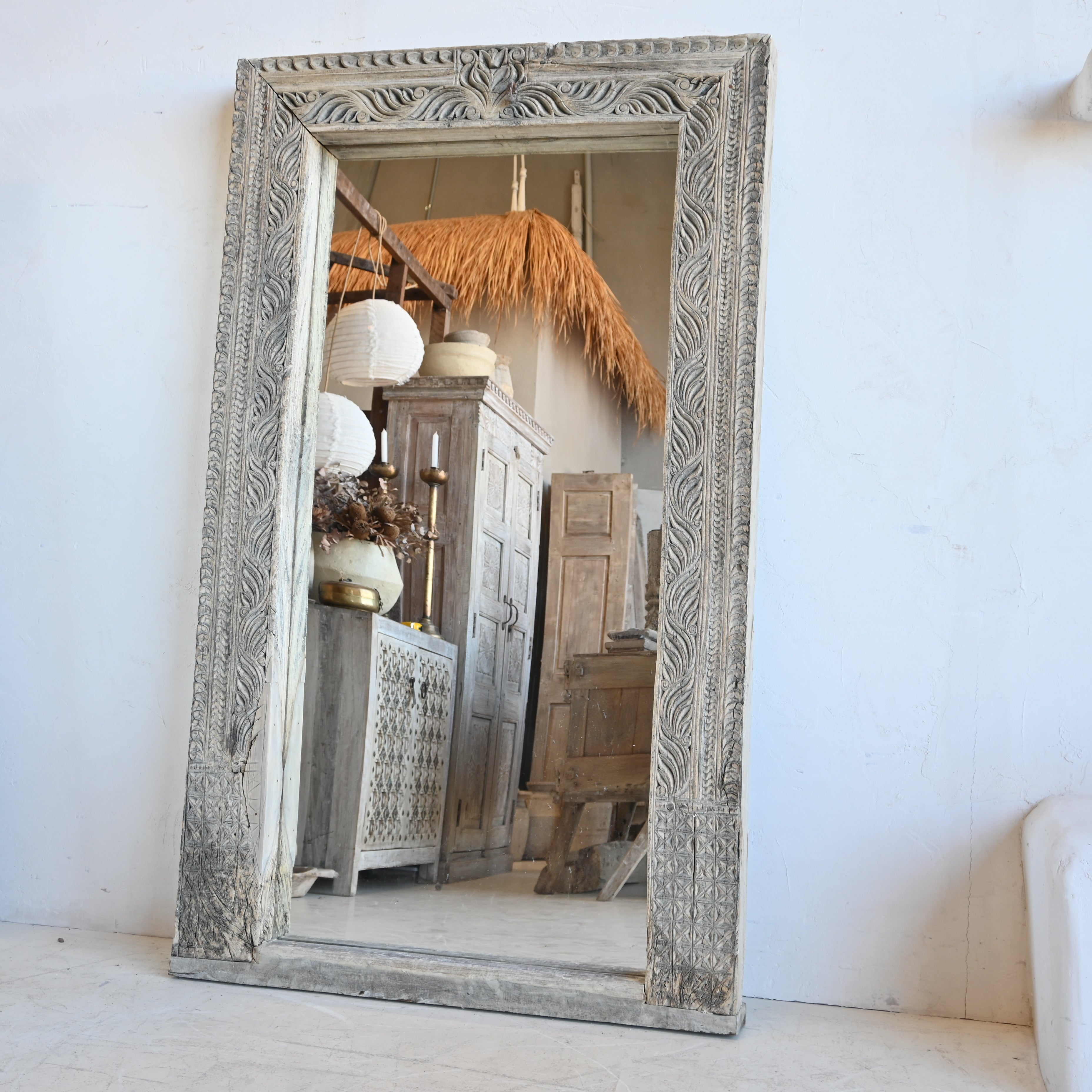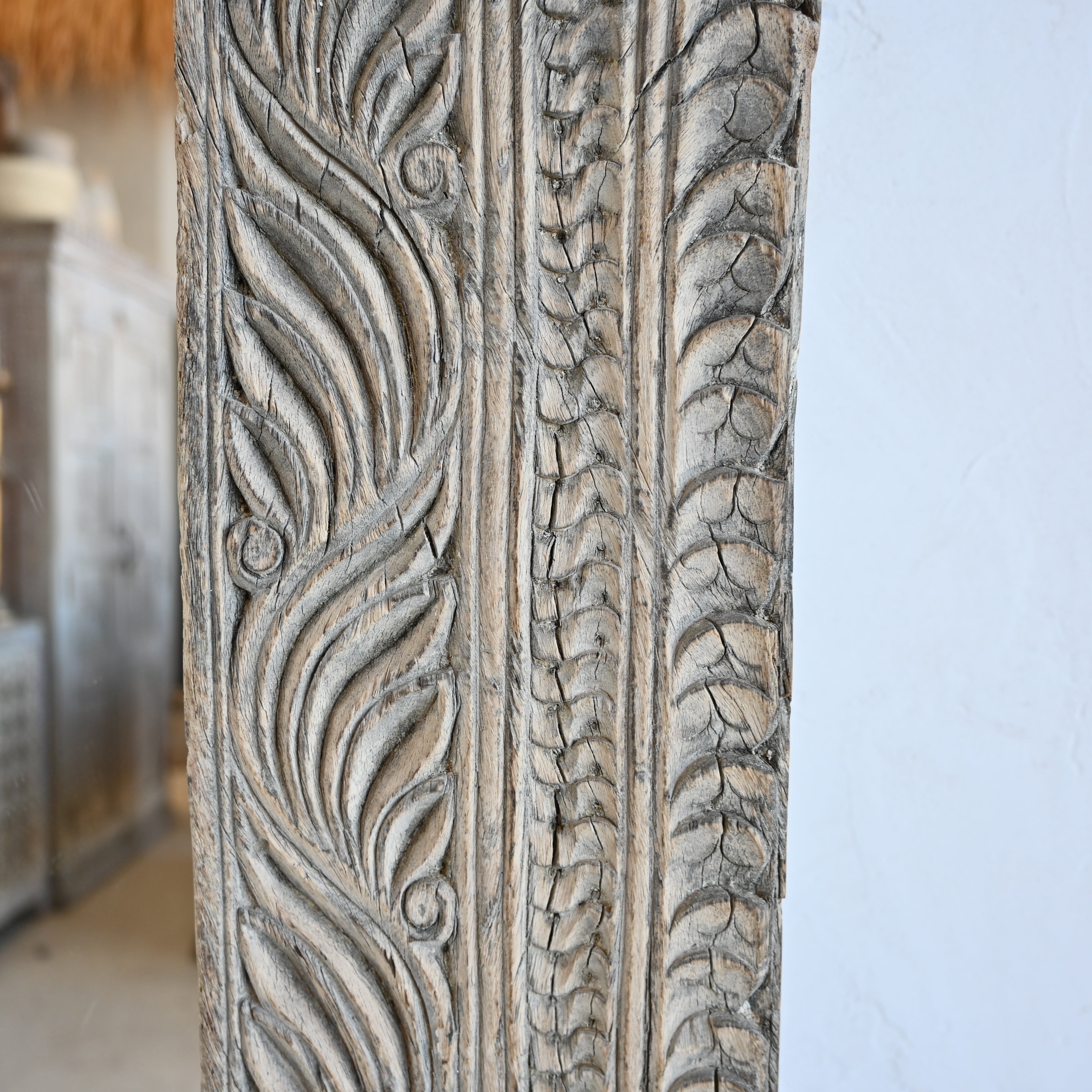 This Vintage one of a kind mirror, sourced in North West India, is made using an old teak Door frame, carved in intricate detail. It has been lightened to create a soft light creamy, beige colour highlighting it's beautiful aged patina. This stunning piece will create impact in any area of your home, not only will it be a talking piece, Mirrors bounce light around and create the illusion of a larger, brighter space.