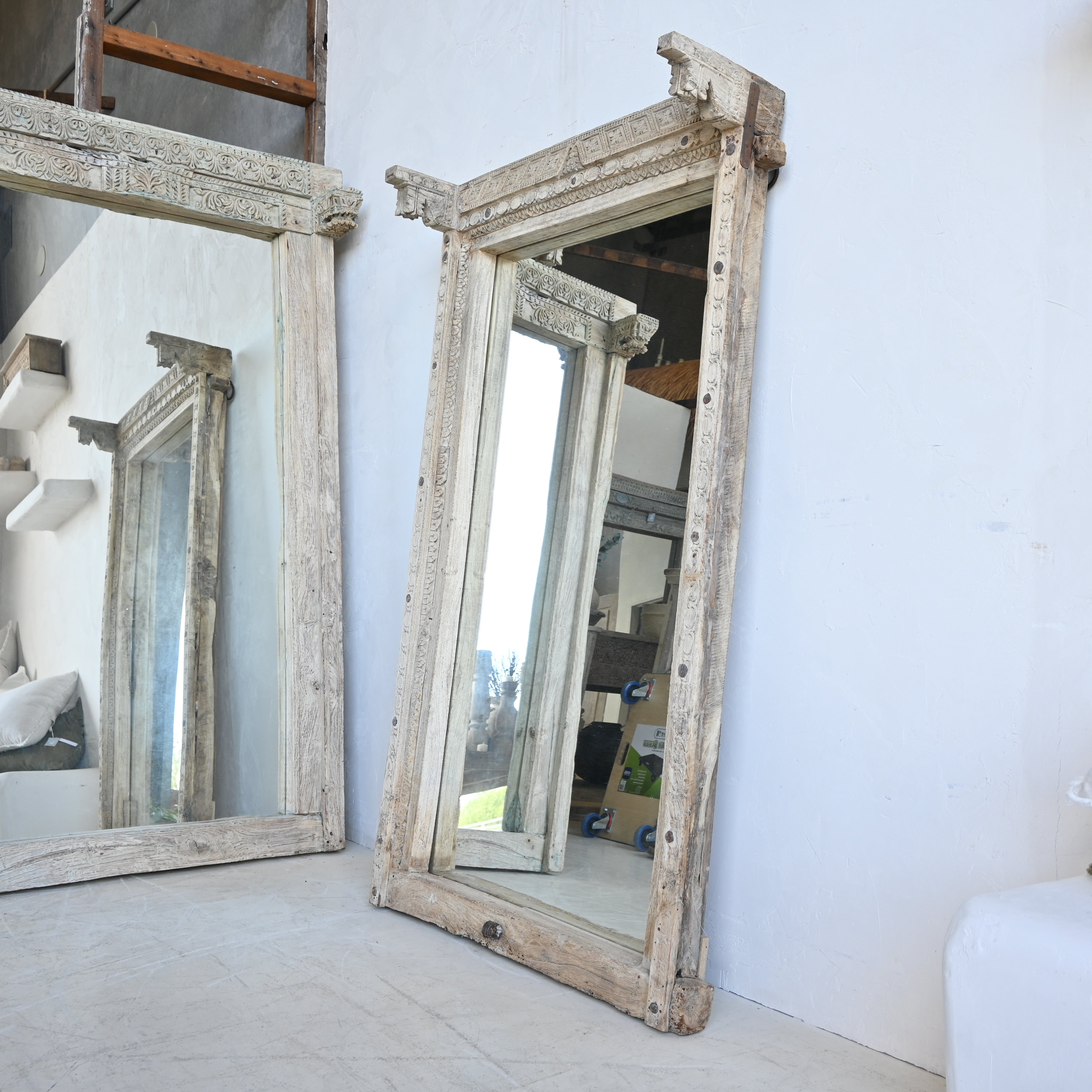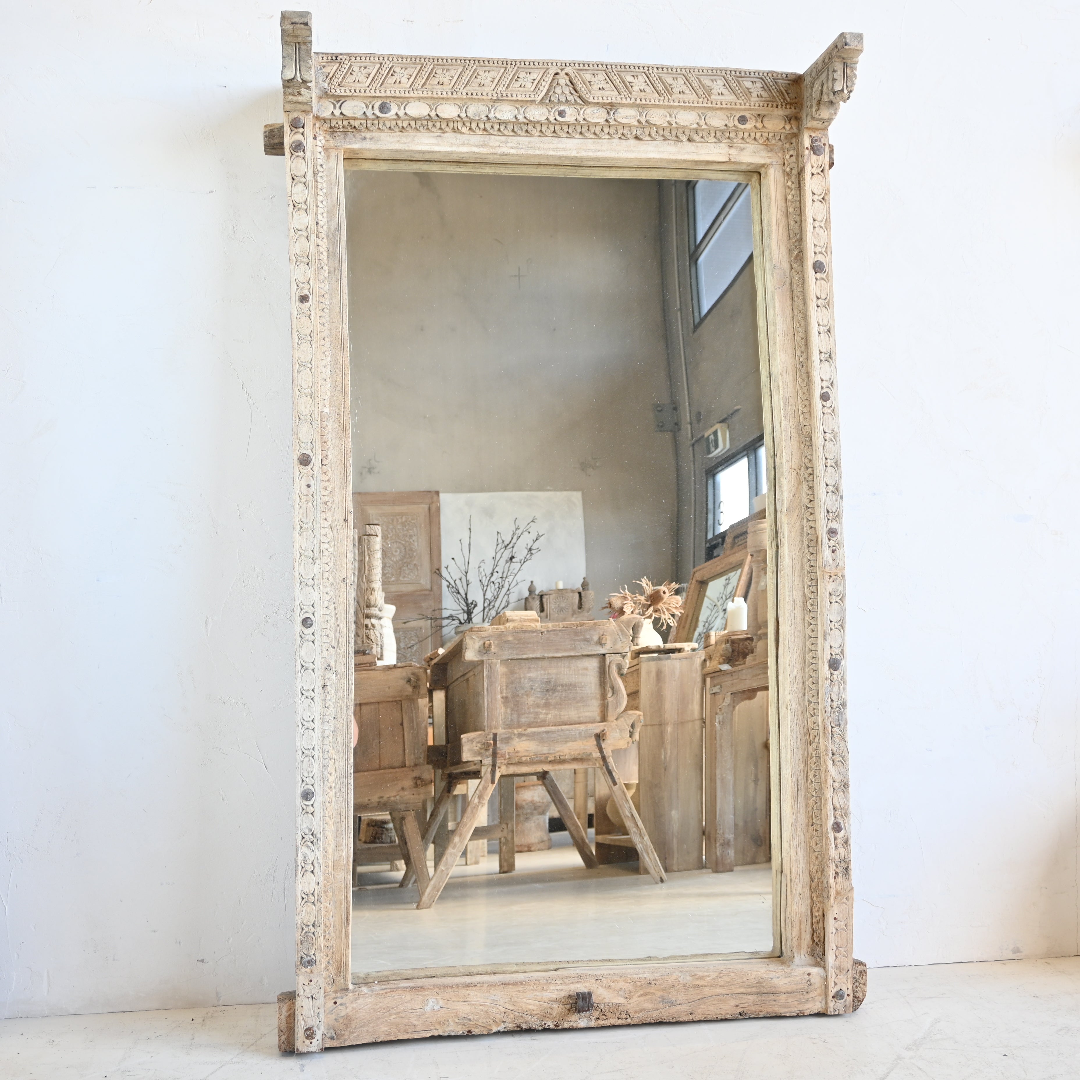 This Vintage one of a kind mirror, sourced in North West India, is made using an old Door frame, carved in intricate detail. This particular piece still bears the finials protruding from it's sides that originally housed an awning. It has been lightened to create a soft light creamy, beige colour highlighting it's beautiful aged patina. This stunning piece will create impact in any area of your home, not only will it be a talking piece, Mirrors bounce light around and create the illusion of a larger space.
