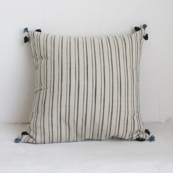 The Hastings cushion is inspired by simple Scandinavian style with a touch of Morocco. It's hand-woven in India using textural ecru cotton with indigo and charcoal stripes. It has Indigo and charcoal cotton tassels on each corner and is finished with...