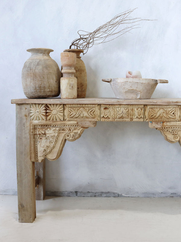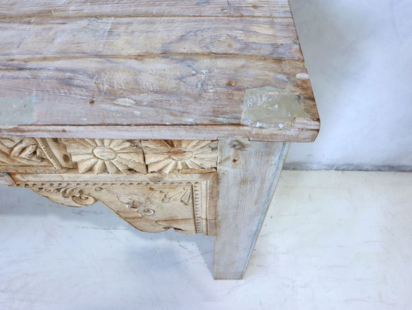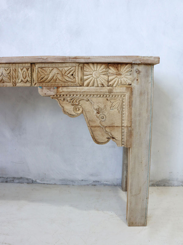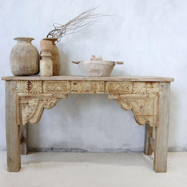 This beautiful console, sourced in North West India, is one of a kind. Made from hand carved hardwood, It has been bleached to obtain the beautiful soft weathered patina you now see. This console would make a stunning statement in...