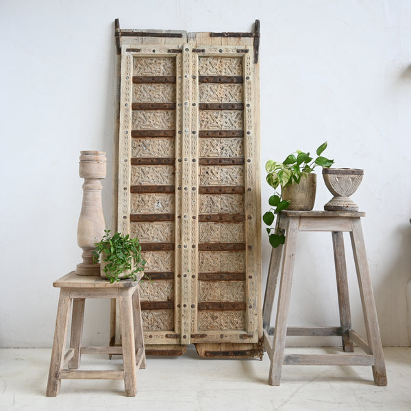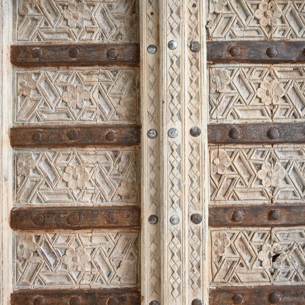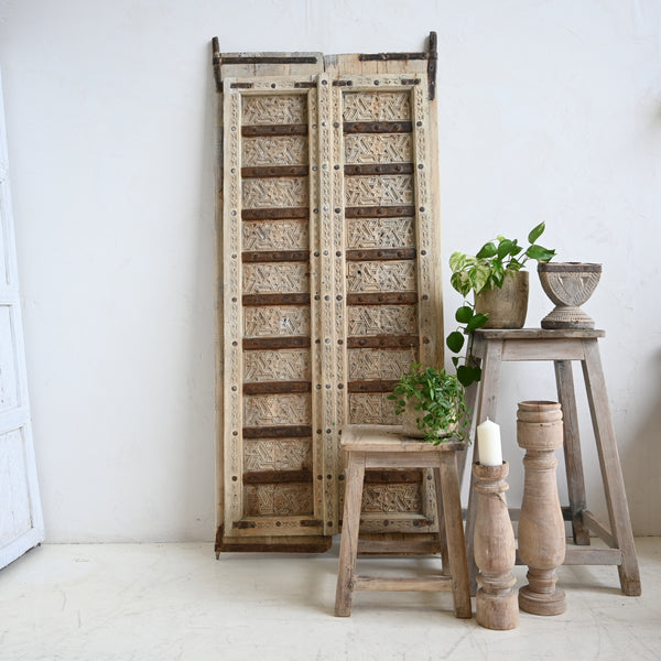 This isĀ an original old door from North West India, carved from teak, and bleached to achieve a beautiful light patina, then finished with metal details and hardware. They can be used for interior or exterior installation. When used outdoors...