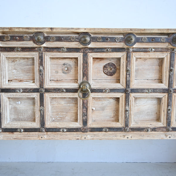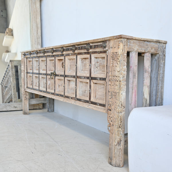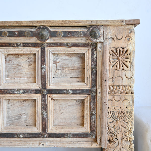This original console has been handmade, combining a vintage Indian door panel finished with iron strapping and tiny flower studs with intricately carved pillars for the legs. It has been stripped of all colour and lightened, to obtain the soft...