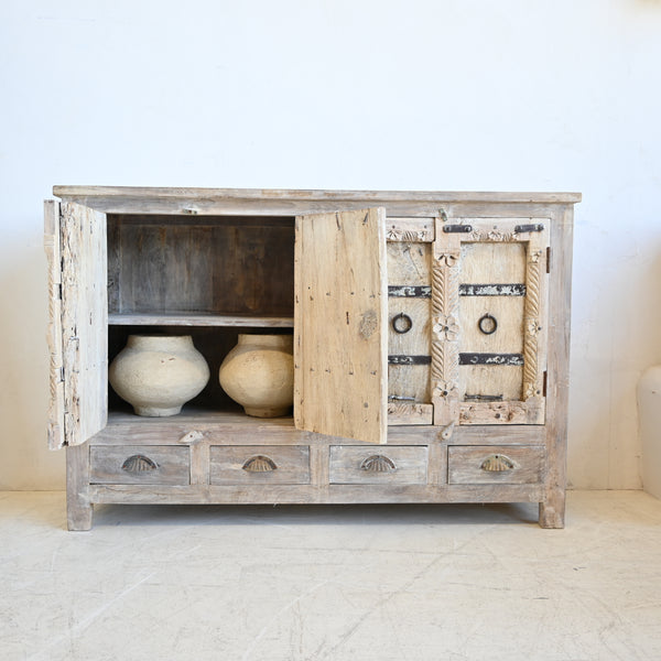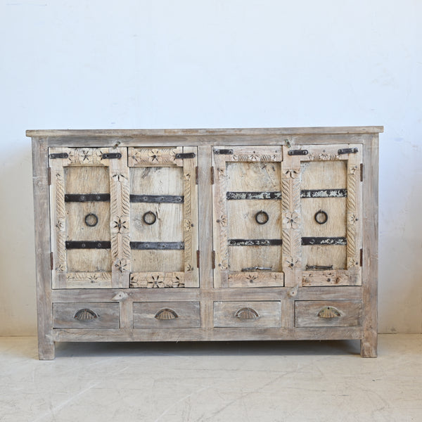 Crafted from reclaimed timber, this sideboard has 4 drawers and four vintage doors. Made with expertise and attention to detail, its simple yet classic design seamlessly combines beauty and sustainability. Elevate your home decor with this one-of-a-kind piece. Dimensions: 89cm...