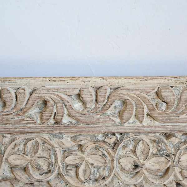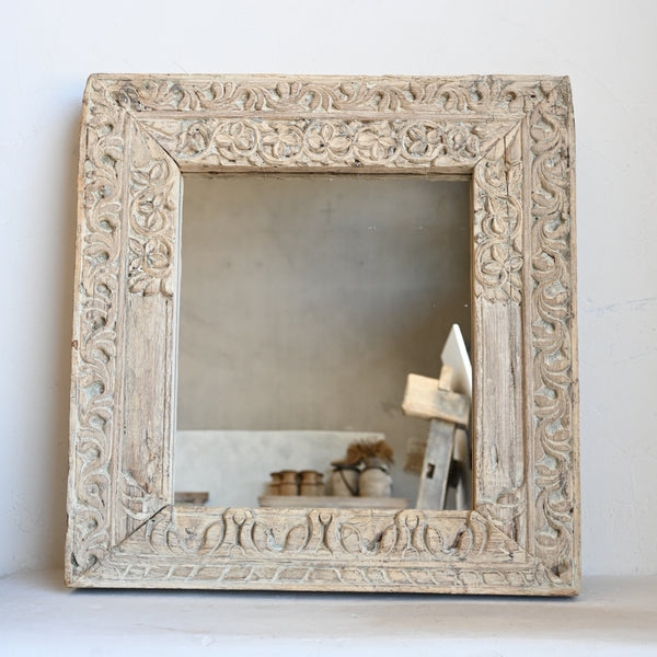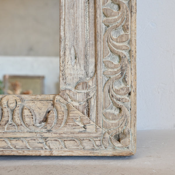This Vintage one of a kind mirror, sourced in North West India,  has beautiful intricate hand carved details. Made from teak and bleached to create a soft light patina, this stunning piece is sure to create impact in any area...
