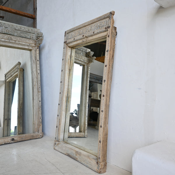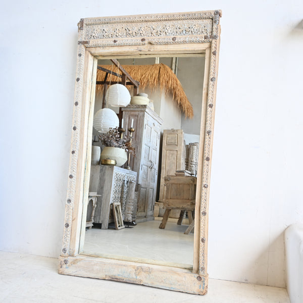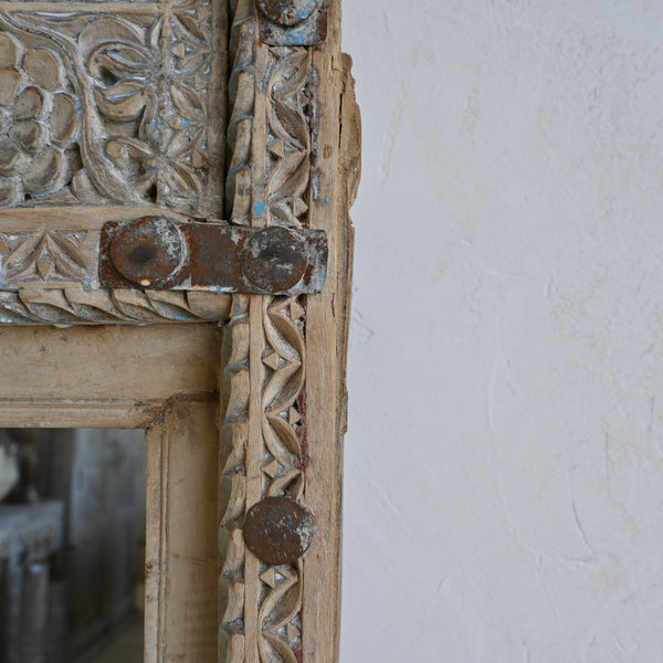 This Vintage one of a kind mirror, sourced in North West India, is made using an old Door frame, carved in intricate detail. This particular piece is adorned with flowers, and finished with metal studs and strapping.  It has been...