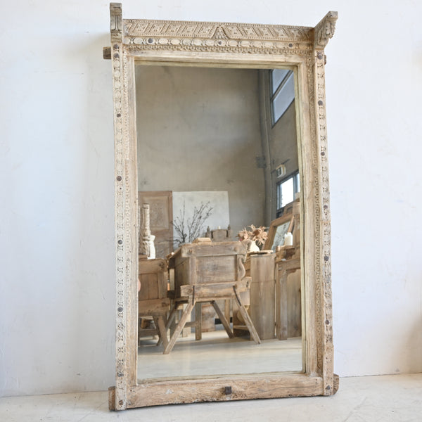 This Vintage one of a kind mirror, sourced in North West India, is made using an old Door frame, carved in intricate detail. This particular piece still bears the finials protruding from it's sides that originally housed an awning. It...